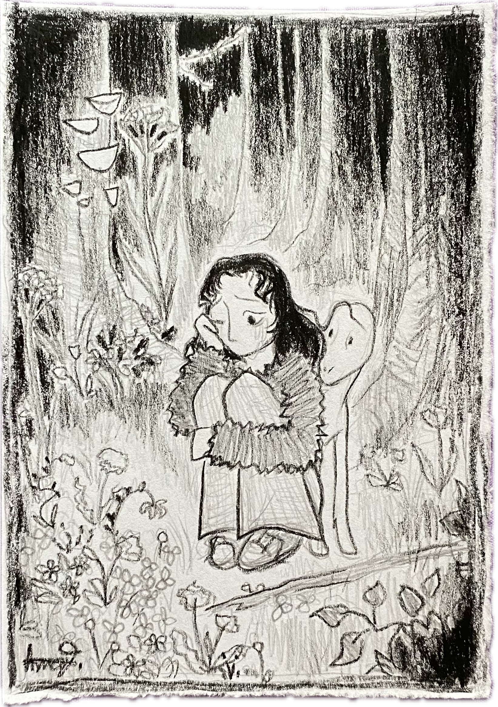 "Pss-pss! Come here!" She called for the creature. He was sniffing the grass nearby. When he saw the blackberries gathered in her palms, he dashed to her side. Her hands and both of their mouths were stained dark red. She picked a leaf and tried to wipe, but the juice wouldn't budge. He licked her palms, but that didn't work either.