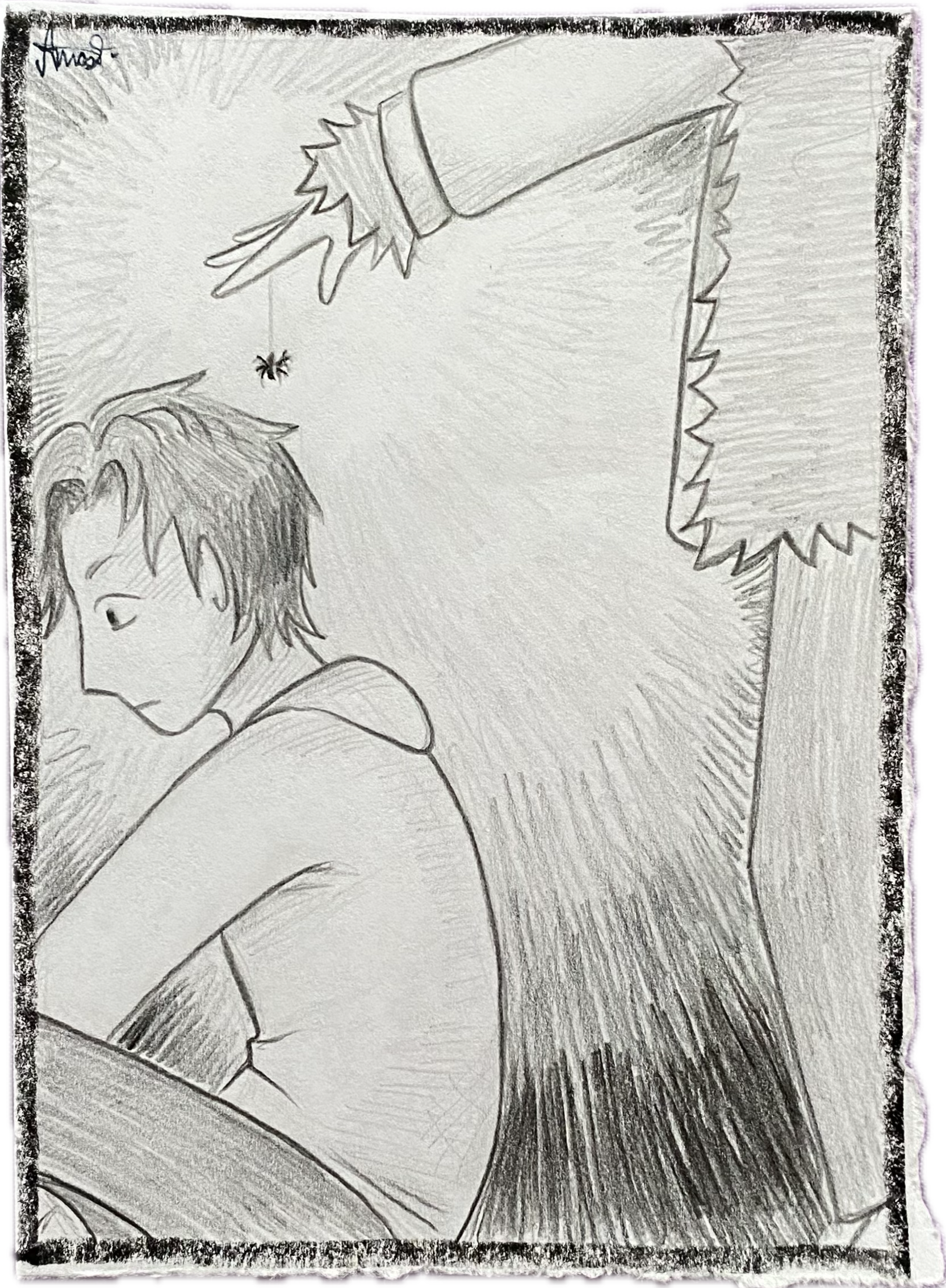 "My back is itchy." He groaned, reaching from the other direction, underneath his shirt. He slowly pulled out his hand and in his palm was a fat, hairy spider.