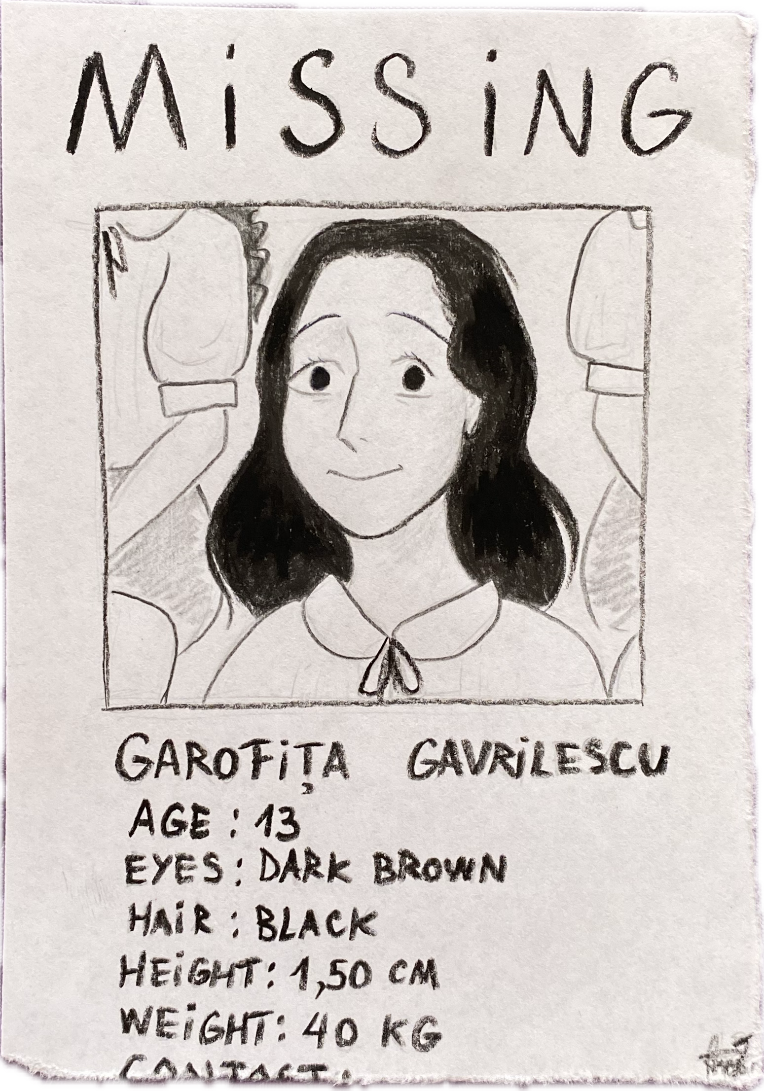 She turned to Vitalis and saw her looking at her. She was looking at Garofița's cheek, at her eye. When she realised, Garofița felt ice in her chest again. No, it was gone, and when she ran away it was already in the green-yellow stage. Was it still visible? Could she tell? Did she see her missing poster too? How much did she know-