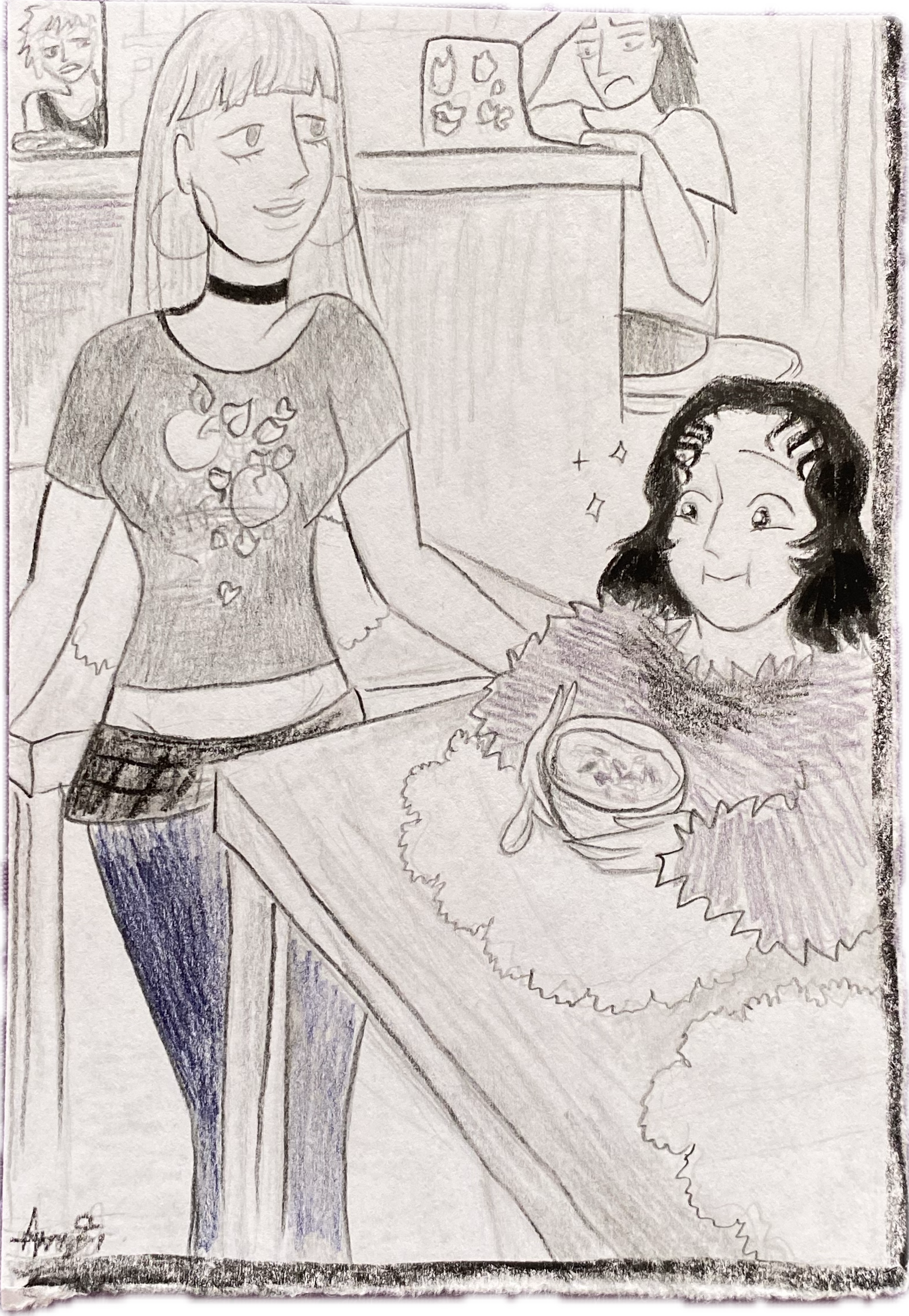 Gabi watched Garofița not pull out a phone or a book or anything of any kind, but quietly look around, studying their decor. She was swinging her feet under the table. It was a dark and cozy place, with simple tables, chairs and shelves with random porcelain trinkets. Each table had a round lace doily, yellowed by time and hot plates. It was like if a humble countryside living room was turned into a restaurant.