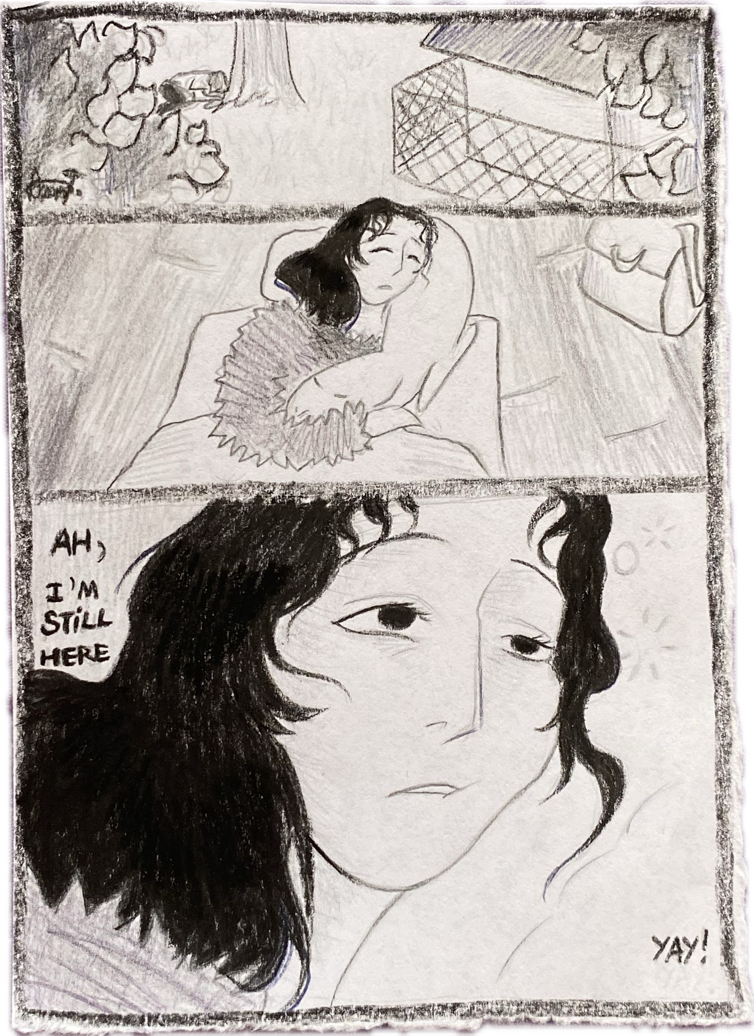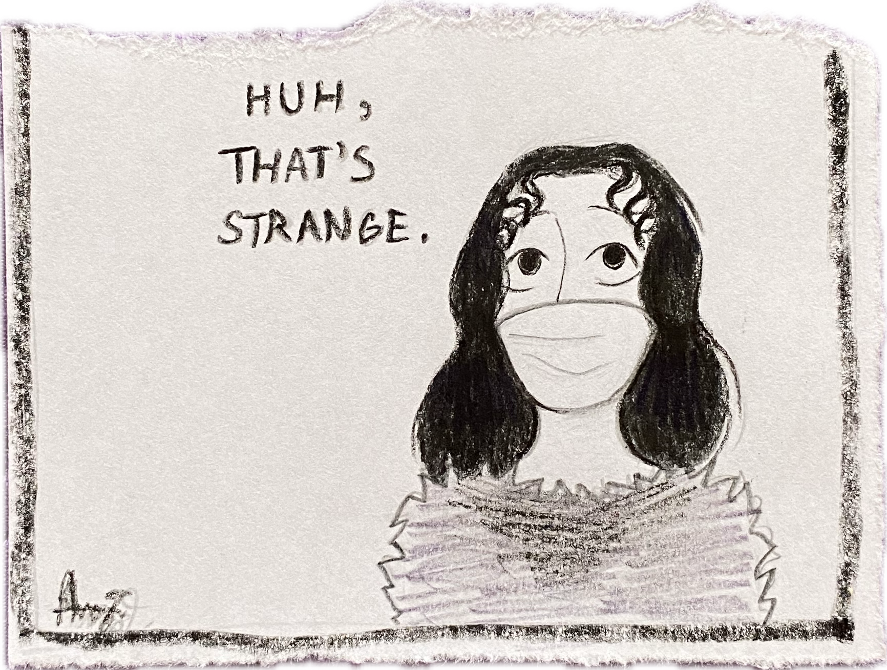 Both of them looked at Garofița, who was pretending not to look at them. She was a small and skinny girl, with ebony hair and white skin. Half of her face was concealed by a blue face mask.