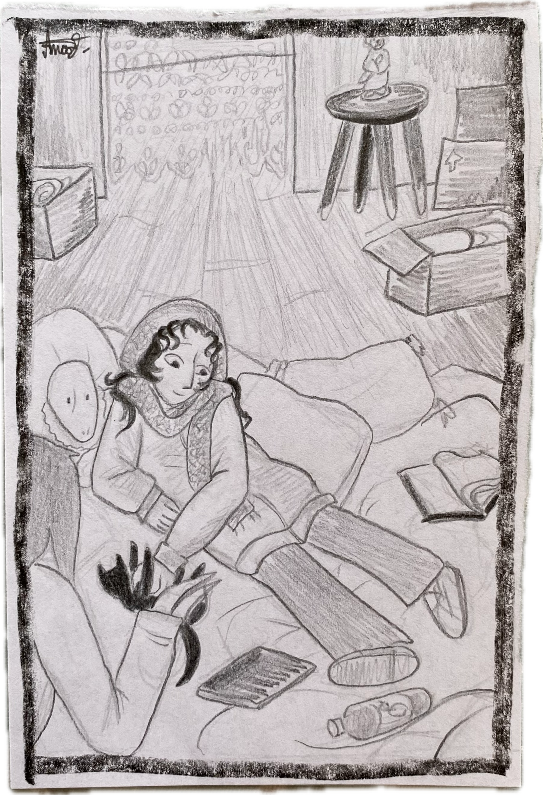 It was remarkably easy to get things from the thrift store or from garbage bins when holes and tears and small stains didn't matter. She found a lace curtain that she hung by the living room's doorframe to make it pretty, only a little unravelled at the ends, and pieces of tarpaulin she nailed around the windows. They billowed when the wind blew and looked ugly as hell, but the icy air didn't get through! Cardboard boxes, pieces of cardboard, shoe boxes and plastic bags were abundant. She felt very smart for noticing the bins near people who loved ordering stuff from vinted, throwing out the DIY packages once they got their goods.